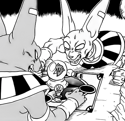 Elsewhere, Beerus is annoyed that his chosen champion ended the duel on the verge of victory. Champa declares the game a draw, but Beerus destroys the game board in a fit of pique. As the two Gods of Destruction bicker, Whis and Vados sigh; yet another game to settle their petty differences has gotten nowhere! With this, Whis returns the two reincarnated souls to whence they came…