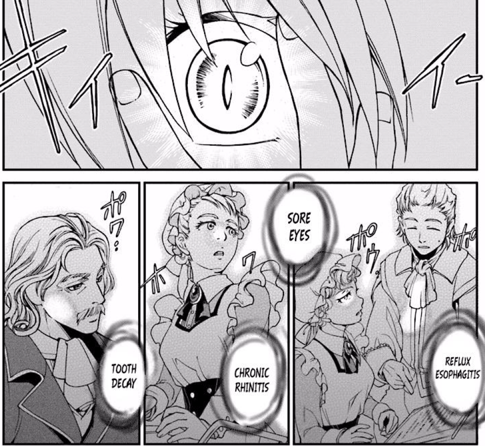 This story gives examples of conditions and diseases that people suffered due to lack of knowledge about health. A noblewoman wanted paler skin, so she turned to bloodletting, causing her to weaken from blood loss. To deal with this, Farma provides her with modern-day foundation and blush since medieval-era cosmetics contain mercury or lead, both of which could poison the human body. A duke is found suffering from blue skin (argyria) due to having eaten pills covered in silver leaf for years. Traditional apothecaries use silver to make the pills last longer and look more beautiful, but the silver deposit in a body darkens when exposed to sunlight, which results in skin discoloration. Farma uses his divine art to eliminate the silver and silver sulphide in the duke’s body, restoring his skin to normal.