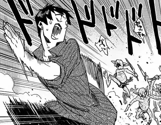 Tsuyoshi Mukoda (向田 剛志, Mukōda Tsuyoshi), a 27-year old adventurer, trader and former salaryman. Friendly, observant, timid and a bit of a coward, he dislikes violence but gradually grows in confidence over the course of his adventures. Although Mukoda usually lets his familiars do his fighting, he is not completely helpless in a fight and can use some fire (e.g. Fireball) and earth magic (e.g. Stone Bullet, Stone Wall), enhanced by blessings given to him by deities in exchange for regular “offerings”. In addition to his Online Supermarket skill, he can also use the Item Box skill, which gives him access to an extra-dimensional space of infinite capacity that can perfectly preserve anything inside. Another notable skill he possesses is Appraisal, which allows him to instantly and accurately identify anything, including magic items. A former part-time restaurant chef, Mukoda is skilled in preparing various dishes, even when using meat from fantastical monsters. Being the only humanoid of his group, he acts as the spokesman whenever they stay at a human settlement.