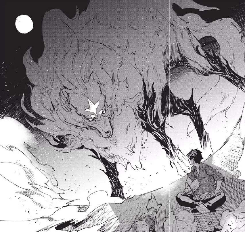 At an inn, Mukoda tries out his Online Supermarket skill and learns that it works like a website from which he can purchase and instantly acquire food and other everyday items from modern-day Japan, from salt, rice, beer and ready-made foods to shampoo, portable stoves (powered by magic) and sleeping bags. After making preparations, he departs for a neighboring country. Along the way, he hires a group of adventurers as bodyguards and prepares their meals using items from the Online Supermarket. One night, they are approached by giant wolf who demands to eat with them! The shocked adventurers tell Mukoda that the wolf is a Fenrir, a powerful, legendary beast and that it would be wise to do as he says. At the end of the meal, the Fenrir learns that Mukoda was the cook and demands to make a familiar’s contract with him. Mukoda reluctantly does so and gives the Fenrir the name Fel.